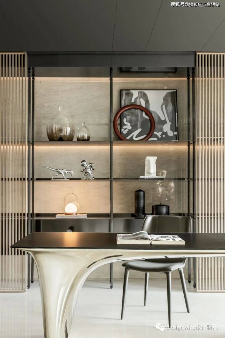 书房一扫印象里的茶香墨韵,取而代之的是现代时尚感。书房与客厅一体化设计,中间设置可以动的隔断空间,既可以扩展社交,也可封闭与卫生间联动,形成新的客套。