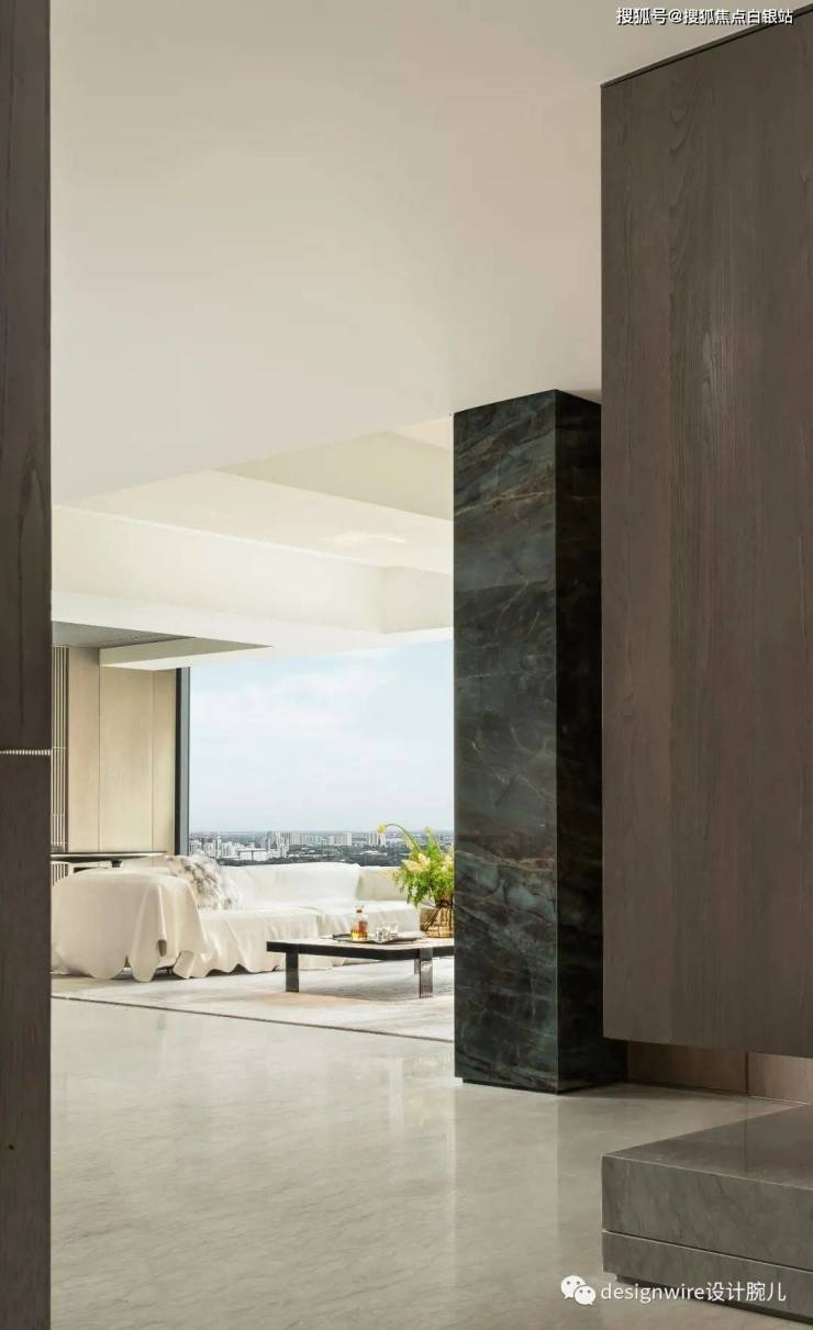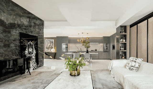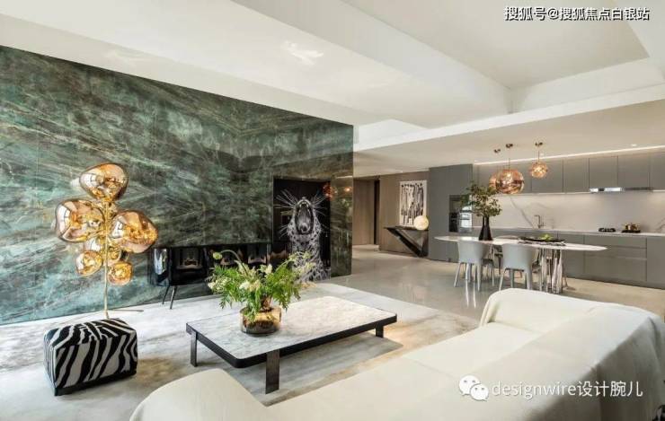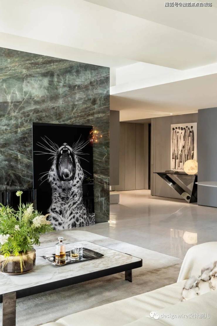 进入客厅,便会被那一抹绿吸引,这是名为绿野仙踪的珍贵石材,拼花则宛若孔雀开屏意向,灵动、委婉,以水彩色点亮空间,让整体更具张力。
