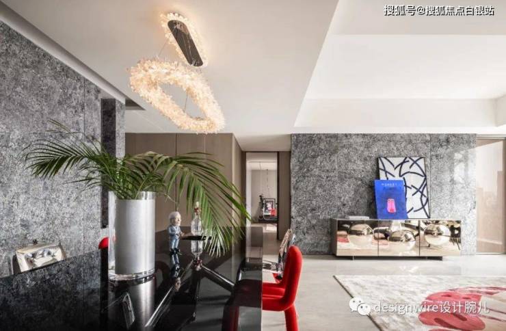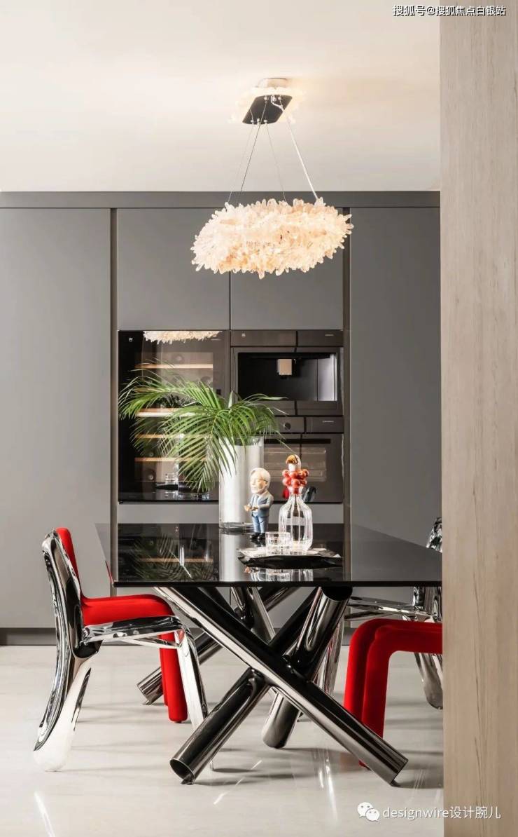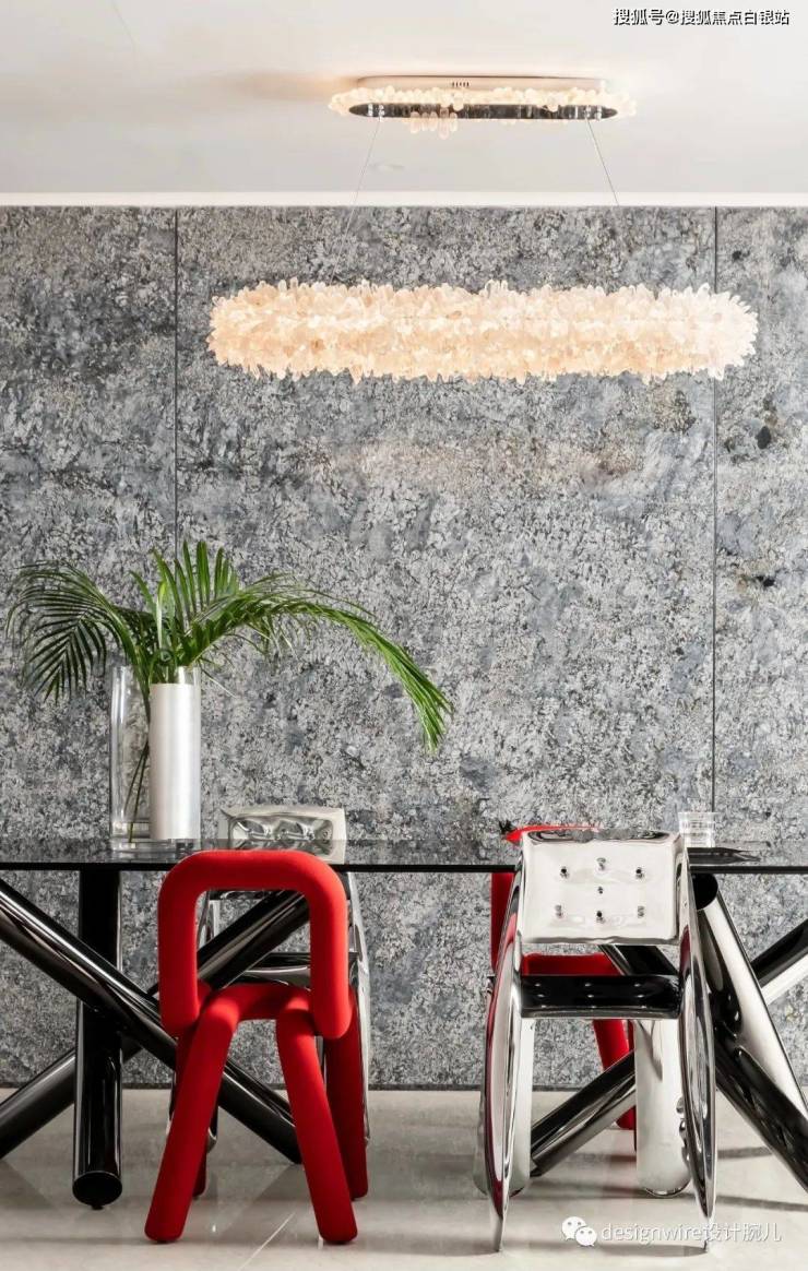 于是餐桌椅大胆混搭混搭,融合不锈钢、金属、布艺等不同材质以及色彩的对撞,打破对传统软装设计的固有印象。