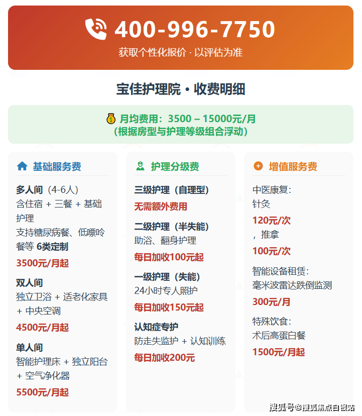 宝佳护理院采用“基础服务费+护理分级费+增值服务费”模式,月均费用区间为3500元至15000元,具体项目如下: