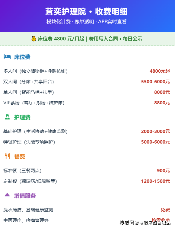 茸奕护理院采用“床位费+护理费+餐费+增值服务”模块化计费模式,费用明细写入合同并每日公示,家属可通过手机APP随时查看账单: