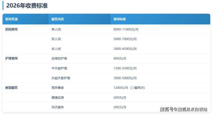 医疗康复费用:根据实际服务项目收取,包括基础医疗服务(包含在护理费内)、特殊康复治疗(50-200元/次)、中医理疗服务(80-150元/次)
