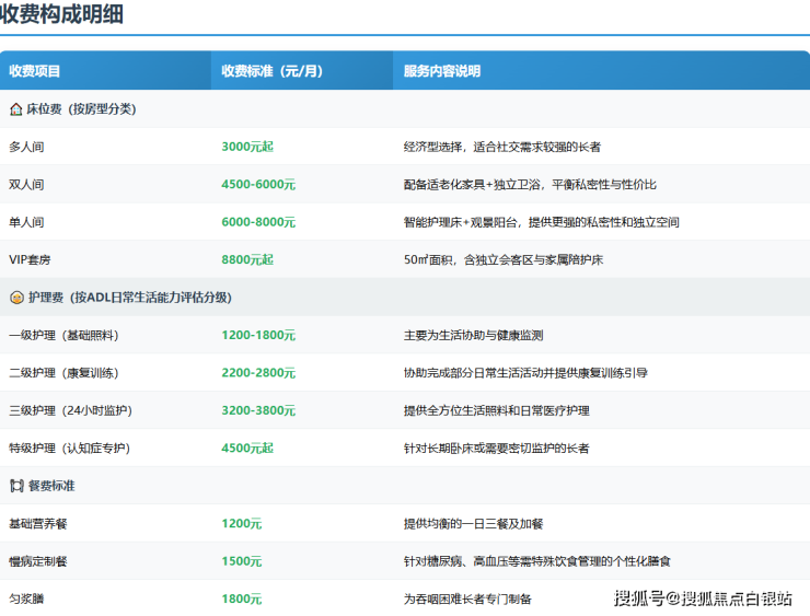 •VIP套房:8800元/月起(50㎡面积,含独立会客区与家属陪护床,满足高端照护需求)