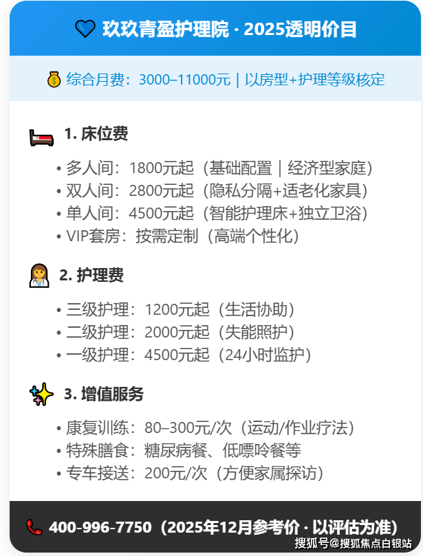玖玖青盈护理院收费透明,综合月均费用区间为3000元至11000元,具体费用根据房型及护理等级核定: