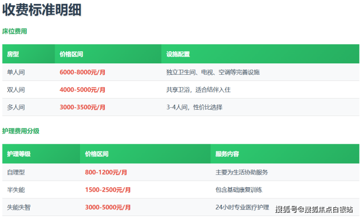 费用示例:一位选择双人间、需要半失能护理的长者,月综合费用约为:4000元(床位费)+ 2000元(护理费)+ 1200元(餐费)=7200元/月。