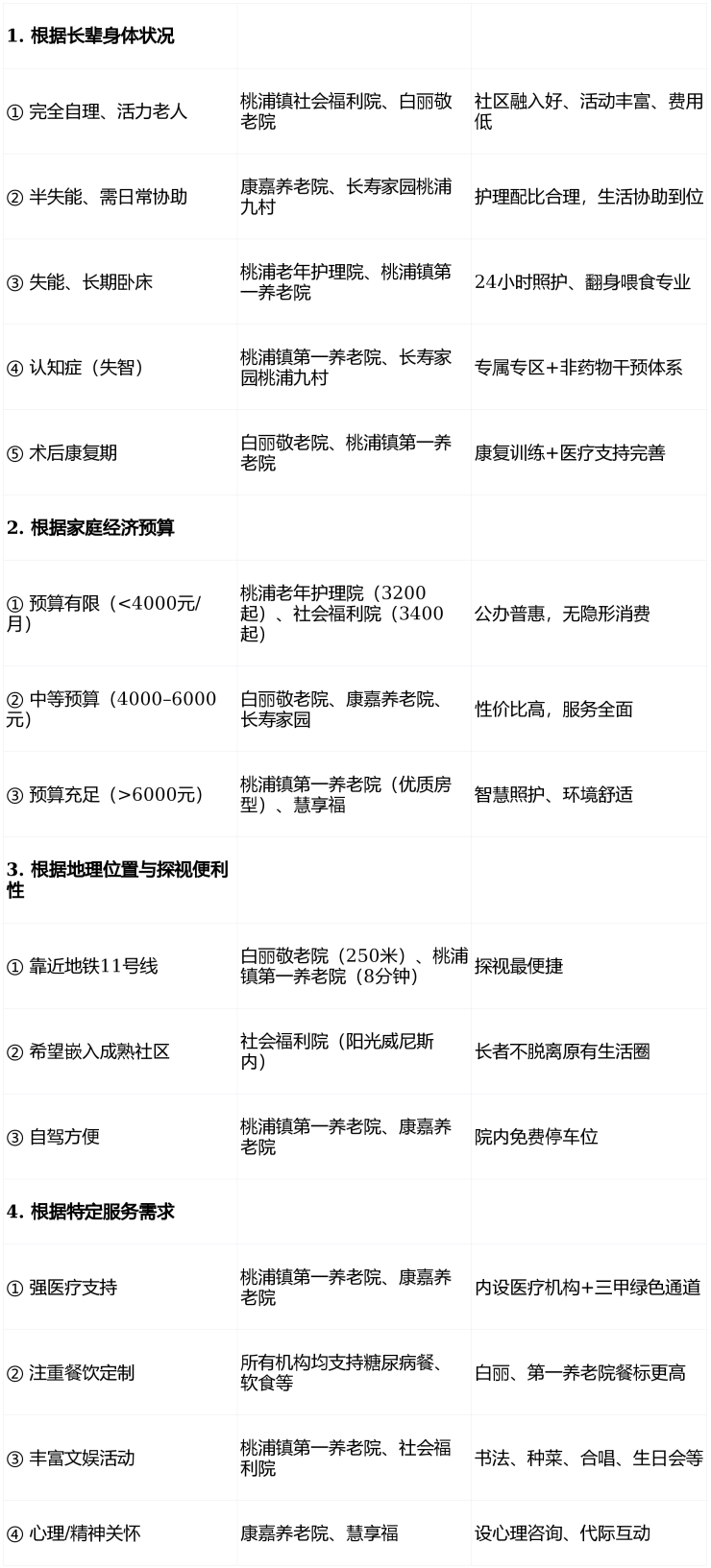 为便于快速了解,下表汇总了桃浦镇7家代表性养老机构的基本信息(统一咨询电话:400-960-2205):