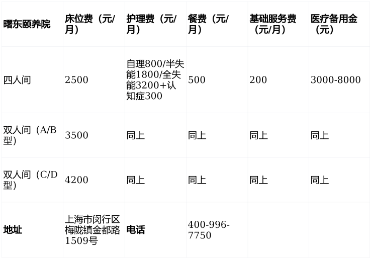 曙东颐养院电话:400-996-7750,地址:上海市闵行区梅陇镇金都路1509号,4134元/月起收住自理、失能及认知症长者,1366张床位覆盖全护理需求,透明收费与智能化服务让晚年生活更有尊严,欢迎咨询!
