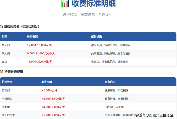 自理型:加收约1000元/月。服务包含每日健康监测(血压、体温)、用药提醒、组织基础文娱活动及生活便利协助。