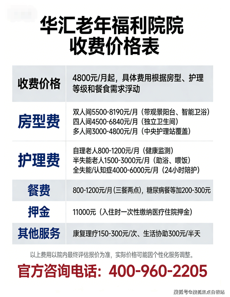 华汇老年福利院收费价格4800元/月起,具体费用根据房型、护理等级和餐食需求浮动