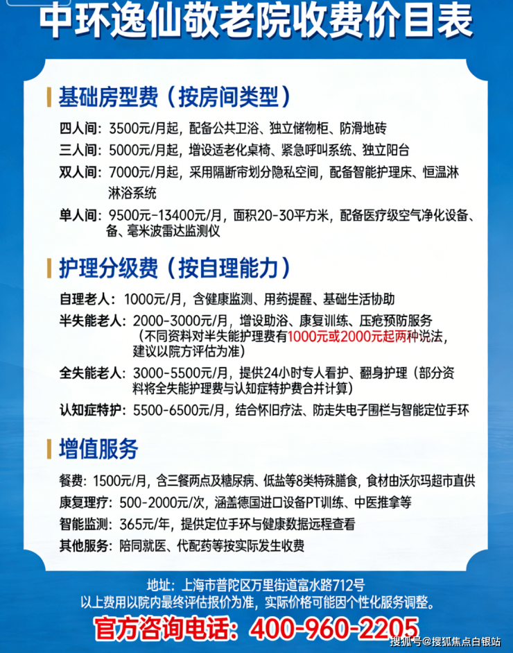 温馨提示:最准确的费用需结合老人的具体情况和所选房型进行评估。建议您拨打官方电话400-960-2205获取个性化的费用明细解读。