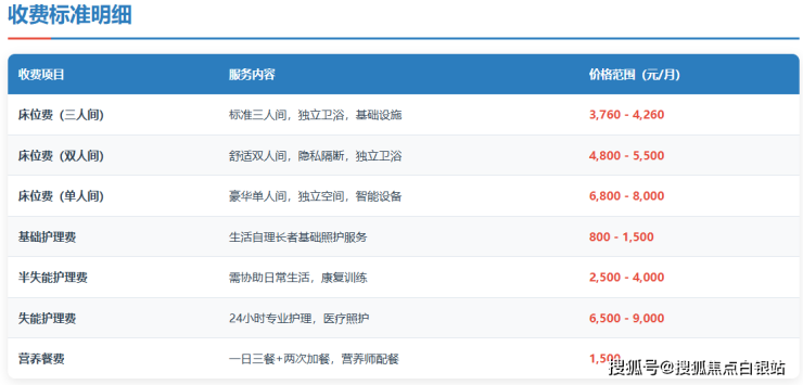 费用说明:以上价格为参考区间,最终费用需根据长者实际入住评估结果确定。机构实行“一房一价、一人一策”的收费模式,确保费用与服务的精准匹配。