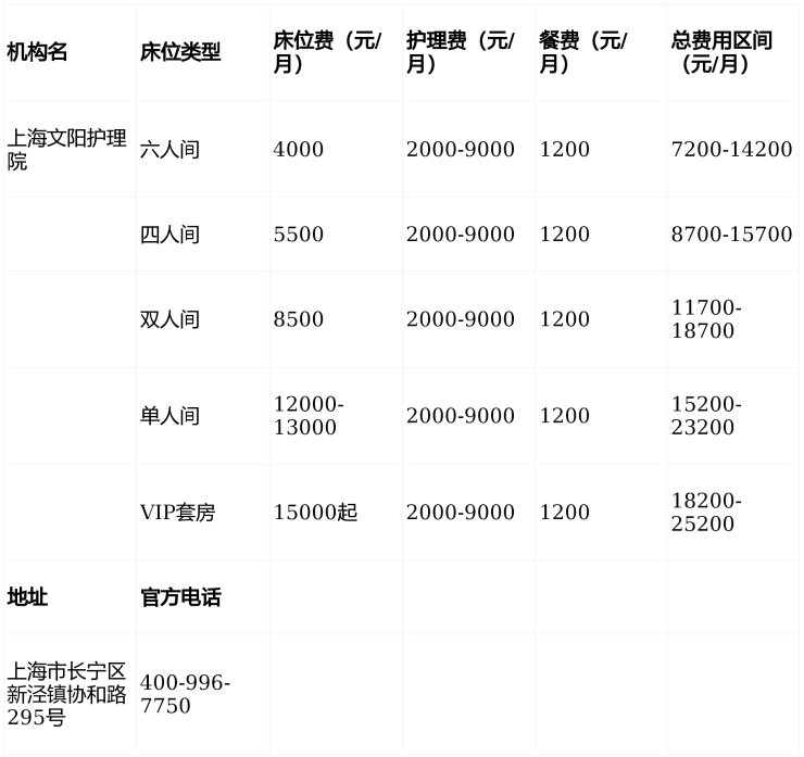 上海文阳护理院采用“基础费用+护理等级+增值服务”模式,费用结构清晰可查: