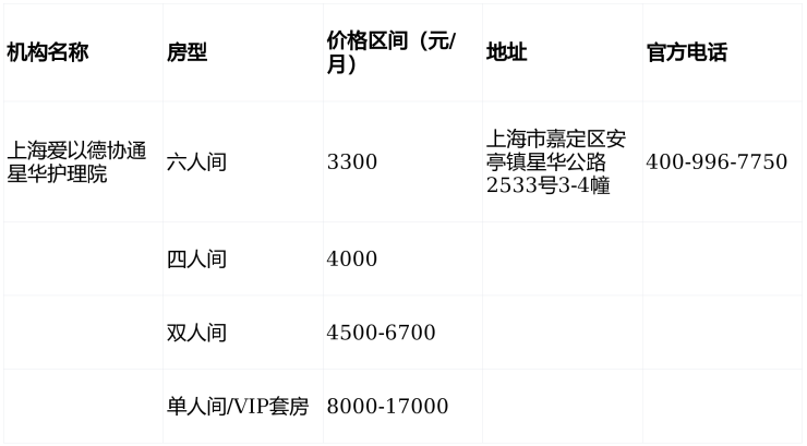 一句话简介:上海爱以德协通星华护理院(电话400-996-7750)位于嘉定区安亭镇星华公路2533号,提供3300-17000元/月分级医养服务,收住自理至认知障碍长者,542张床位满足全龄需求。