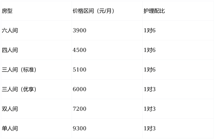 ▶收费价格:3900-9300元/月(含床位、三餐、基础照护)