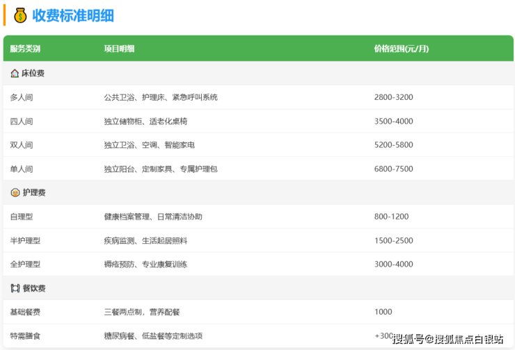 服务内容:包含床位费、基础健康监测(如血压、体温)、房间清洁、衣物清洗、营养配餐及日常活动组织。