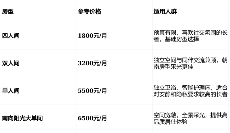 参考起步价格:3000元/月起(根据护理等级与房型组合浮动)