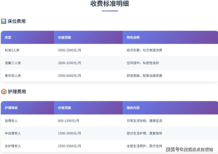 费用构成公式:总月费 = 床位费 + 护理费 + 伙食费 +(可能的特殊服务费)