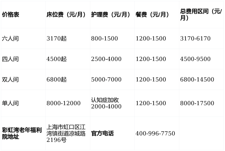 彩虹湾老年福利院电话400-996-7750,地址虹口区江湾镇街道凉城路2196号,提供3170元/月起的多层次医养服务,涵盖自理至认知症长者全周期需求,是上海中心城区高性价比养老优选。