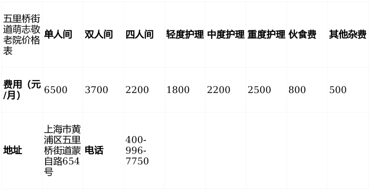 五里桥街道萌志敬老院4000元/136床位价格:黄浦区地址收费3月电话