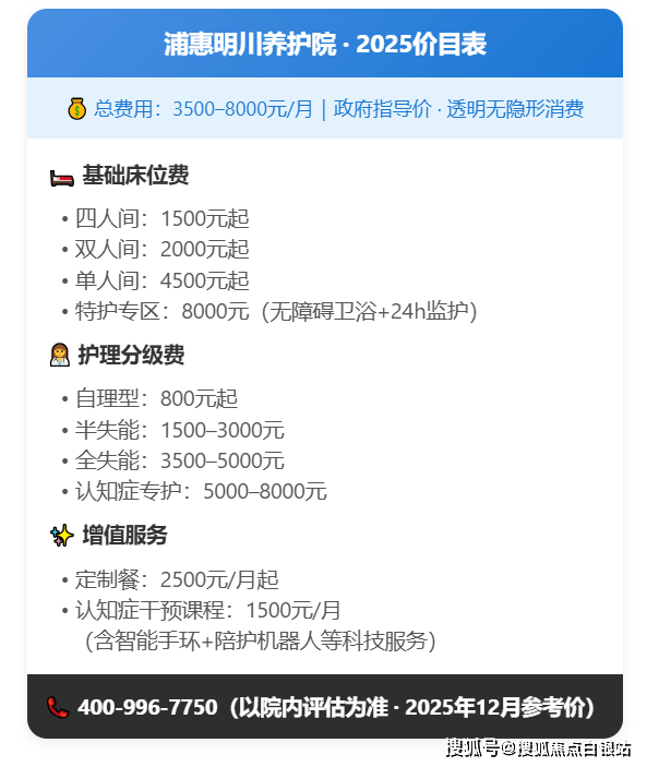 浦惠明川采用“基础套餐+护理分级+房型差价+增值服务”模式,月度总费用3500-8000元,具体构成如下: