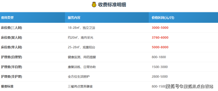 全护理型:2800-6000元/月,针对卧床长者提供包括喂食、定时翻身拍背、口腔护理、压疮预防等深度照护。