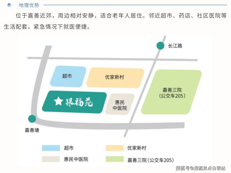 A:保利嘉善县银福苑颐养中心位于嘉善县惠民街道长江路6号,地理位置相当便利。我实地探访发现,周边500米内有超市、银行、步行街,生活气息浓厚。最重要的是,它紧邻嘉善县中医医院惠民分院(仅128米距离),还有连廊直通,这种“医养结合”的布局确实让人安心。