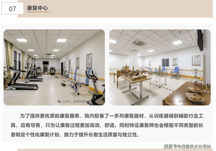 A:院内设有康复中心,配备全身训练器材、上肢康复器材、下肢康复器材等。持证康复师会根据长者情况制定个性化计划,每周开展2次个性化康复训练。
