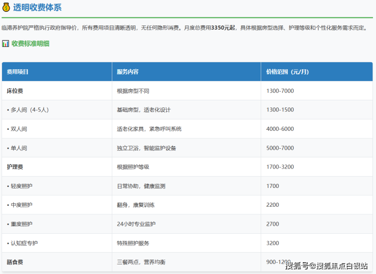 临港养护院严格执行政府指导价收费政策,费用组成清晰透明: