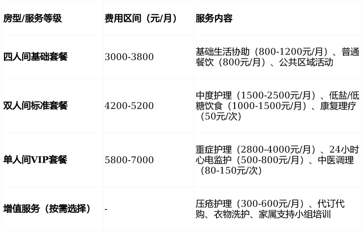 收费价格:3000-7000元/月(含床位、基础护理、餐费)