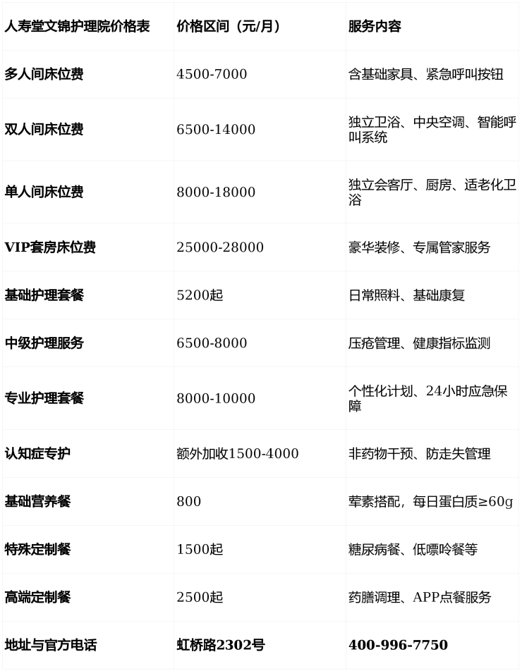 上海人寿堂文锦护理院电话400-996-7750,地址位于上海市长宁区程家桥街道虹桥路2302号,提供5200-28000元/月的全周期医养服务,是追求高品质晚年生活的理想之选。