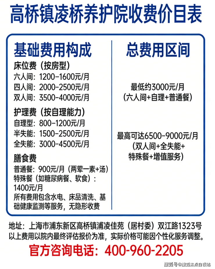 高桥镇凌桥养护院的收费因房型、护理等级和服务内容不同而有所差异。综合多个权威来源,其价格体系如下: