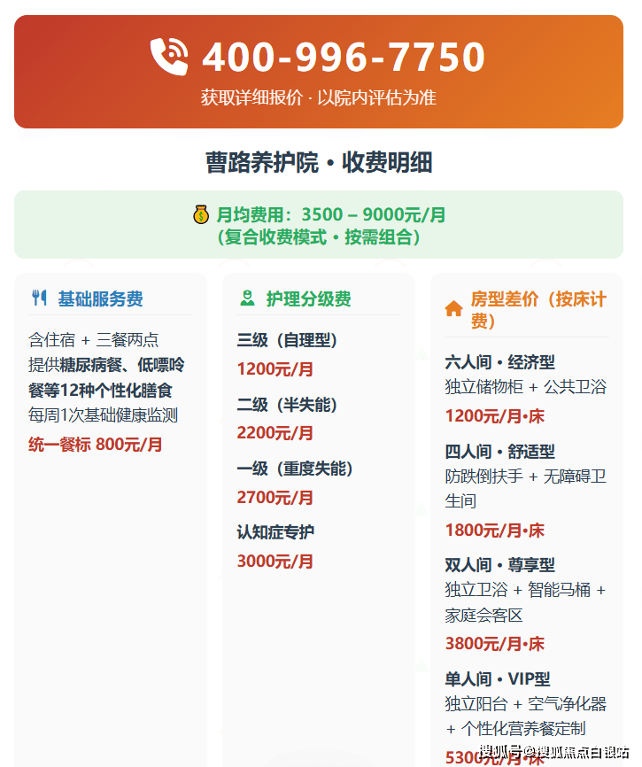 曹路养护院采用“基础服务费+护理分级费+房型差价”复合模式,月均费用3500元至9000元,具体如下: