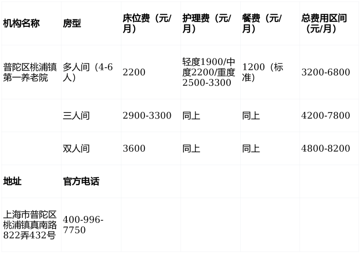 一句话简介:普陀区桃浦镇第一养老院电话400-996-7750,地址真南路822弄432号,提供3200-8200元/月医养服务,涵盖自理至失能照护,适老化设施完善,性价比高。