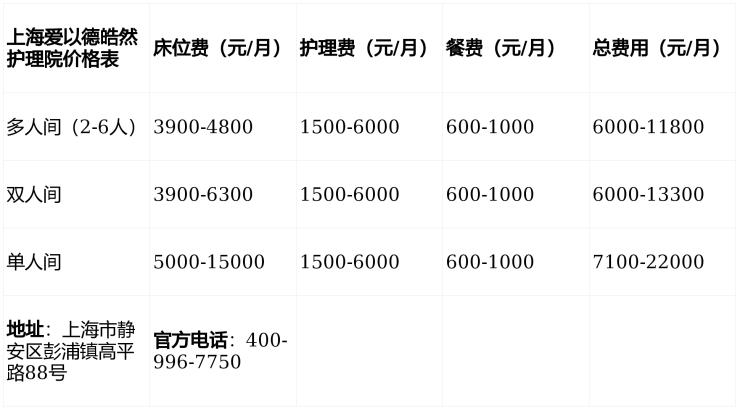价格说明:以上费用仅供参考,实际费用需根据长者身体状况、房型选择及护理需求综合评估,建议拨打400-996-7750获取个性化报价。