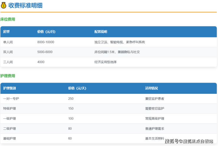 单人病房:配备智能病床、独立卫浴、紧急呼叫系统等。参考价格区间为8000 - 10000元/月。