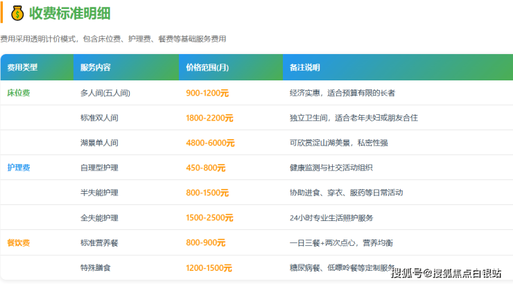 综合计算示例:一位选择双人间、需要介助型护理的长者,月均费用约为:1800元(床位费)+ 650元(护理费)+ 850元(餐费)=3300元/月左右。实际总费用会因房型选择、具体护理需求和个性化服务而浮动,最终价格需经院内专业评估后确定。