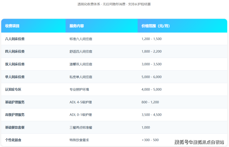 具体费用根据房型选择、护理等级以及个性化服务需求进行动态调整。所有费用均公示上墙,无任何隐性消费,接受家属全程监督。