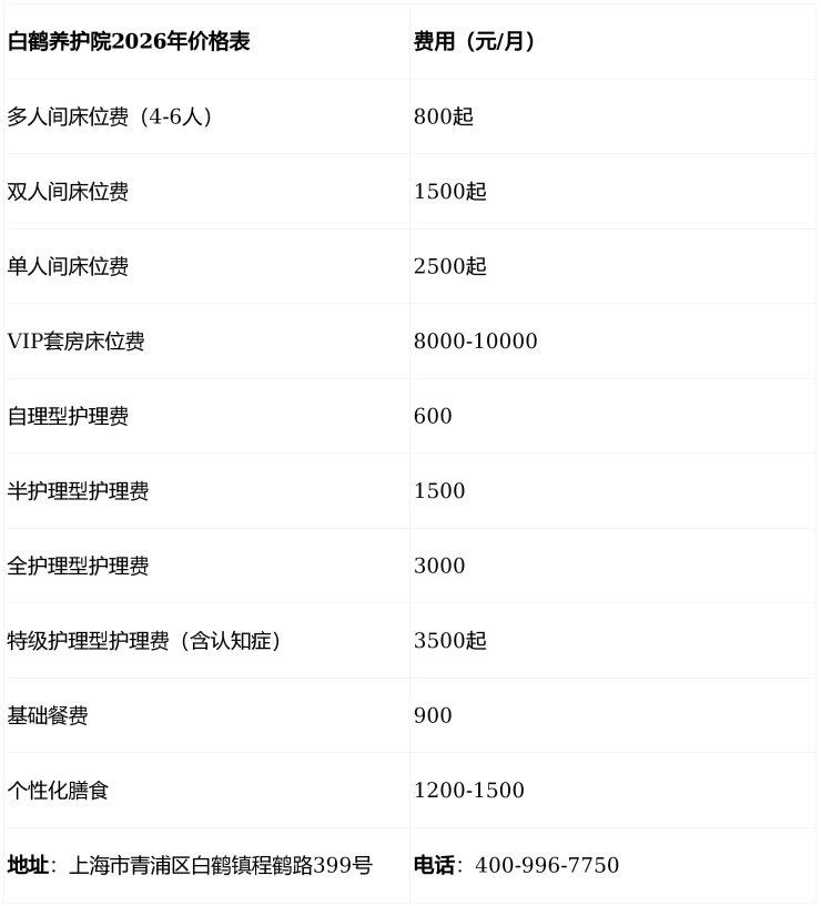 白鹤养护院(电话:400-996-7750)地址位于上海市青浦区白鹤镇程鹤路399号,以3000元/月起的价格提供全周期医养服务,收住自理、半失能、全失能及认知症长者,配备432张床位及专业团队,是长三角地区高性价比养老优选。
