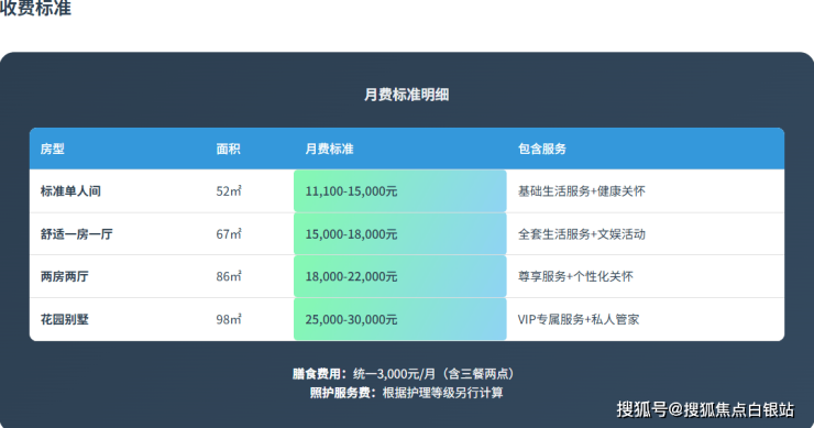 根据房间类型、面积和配置的不同,月费标准在11100-27000元之间。这一费用区间涵盖了多种户型选择: