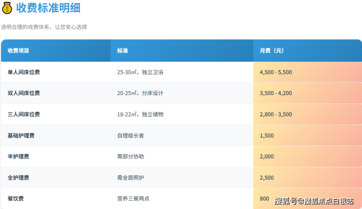 逸仙天山养老院实行透明化收费制度,具体收费标准如下: