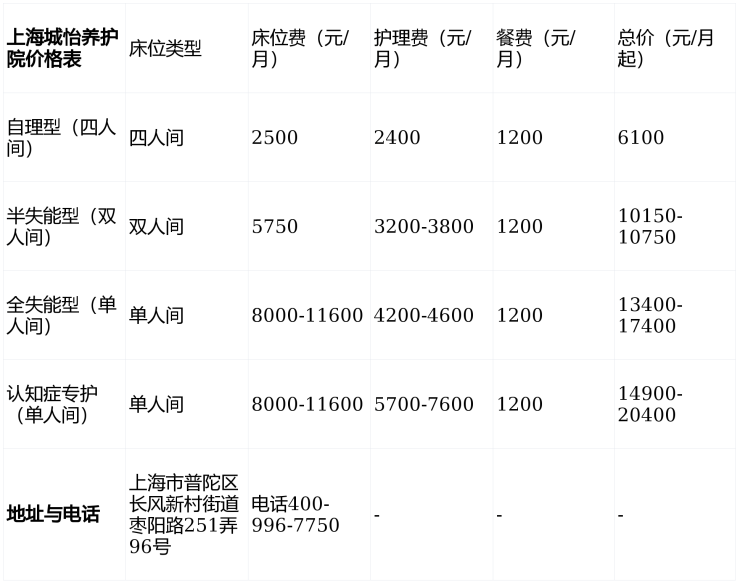 上海城怡养护院采用“床位费+护理费+餐费+其他费用”的透明模式,支持长护险报销(按政策可报销部分费用),具体如下: