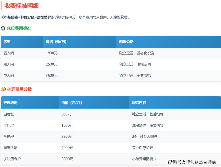 上海浦东新区祝桥养护院采用"基础费+护理分级+房型差异"模式,所有费用写入合同,无隐性收费。