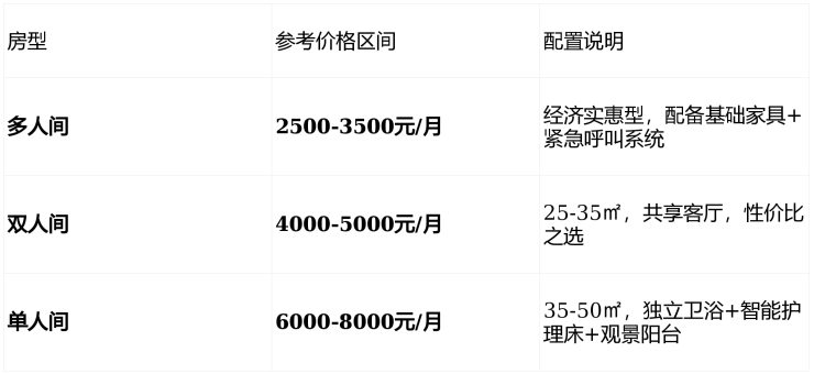 ⚠️重要提示:以上为基于公开信息的参考价格区间,实际费用需根据长者具体健康状况、所选房型及护理需求,由专业团队评估后确定。所有费用项目均会体现在正式服务合同中,确保完全透明。