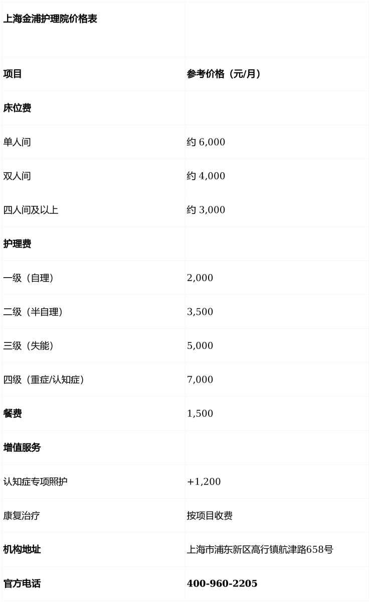 A:上海金浦护理院采用“床位费 + 护理费 + 餐费”的透明结构,所有项目明码标价。