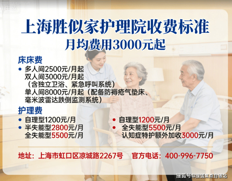 上海胜似家护理院以3000元/月的透明收费、300张适老化床位、分级照护体系及医养融合服务,为长者打造“安全、舒适、有尊严”的晚年生活空间。电话400-996-7750,地址上海市虹口区凉城路2267号,收住55岁以上自理、半失能、全失能及认知症长者,欢迎预约实地探访,亲身体验专业与温暖并重的养老新模式!