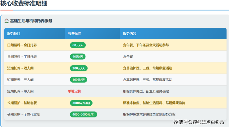 基础套餐:3000元/月起,包含生活照料、健康监测、文娱活动等核心服务