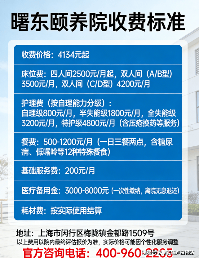 曙东颐养院收费价格:4134元/月起,费用结构清晰透明,包含以下项目: