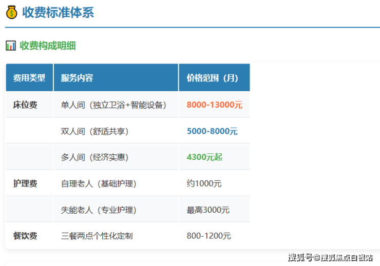 从轻度照护1000元/月到专护服务10000-12000元/月(面议),满足不同健康状况长者的需求。