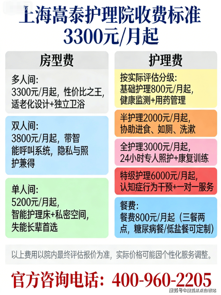 上海嵩泰护理院收费标准3300元/月起,采用"床位费+护理费+餐费"的清晰计费模式,无隐形消费。具体明细如下: