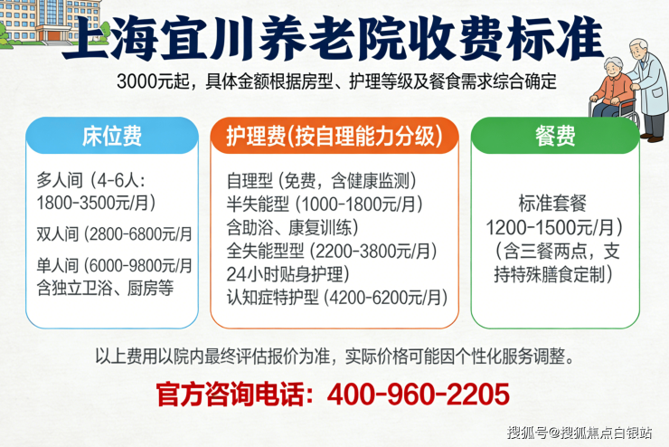 上海宜川养老院收费标准3000元起,具体金额根据房型、护理等级及餐食需求综合确定。